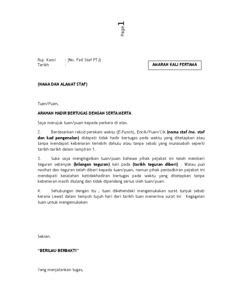 Contoh Surat Amaran Tidak Hadir Kerja Surat Amaran 1 Surat Ini Adalah Dirujuk Kepada Mesyuarat Tergempar Yang Diadakan Pada 10 Oktober 1988 Mengenai Isu Kelewatan Justeru Itu Sila Hadir Ke Tempat